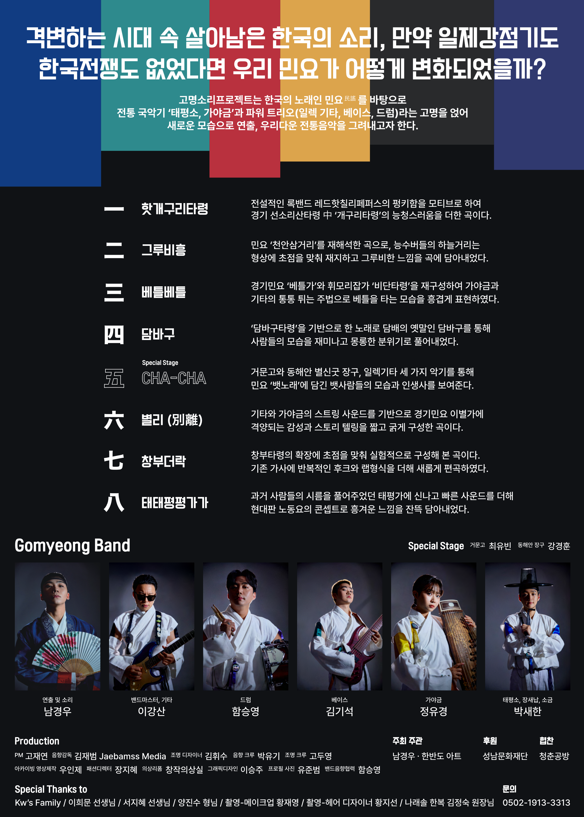 Combining genres like rock, R&B, funk, and jazz, the performance infused “Gomyeong” (ornamental flair, Topping) into Korean charm, added improvisational energy and vibrant rhythms that showcase the technical prowess of a gugak band. In March 2025, Gomyeongsori Project released an EP album, selecting six standout tracks from live performances.